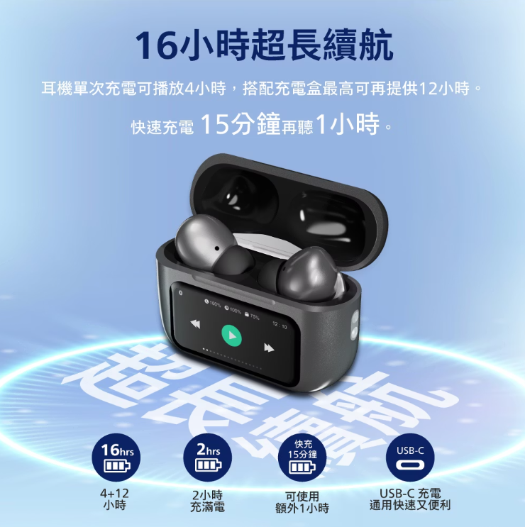 ✦16小時超長續航,快速充電15分鐘再聽1小時