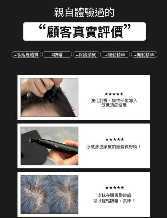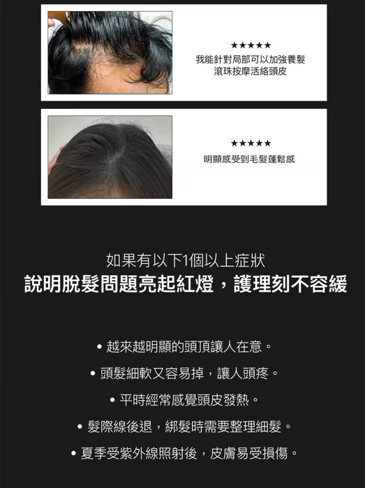 適合頭髮細軟易掉體質,滾珠按摩活絡頭皮,局部重點養髮