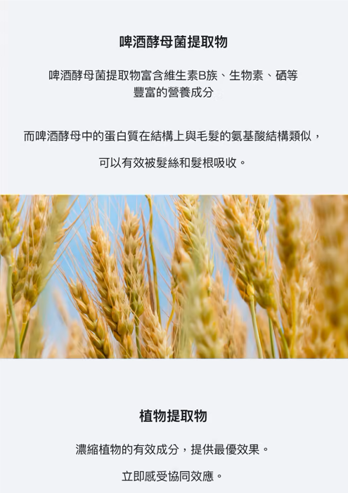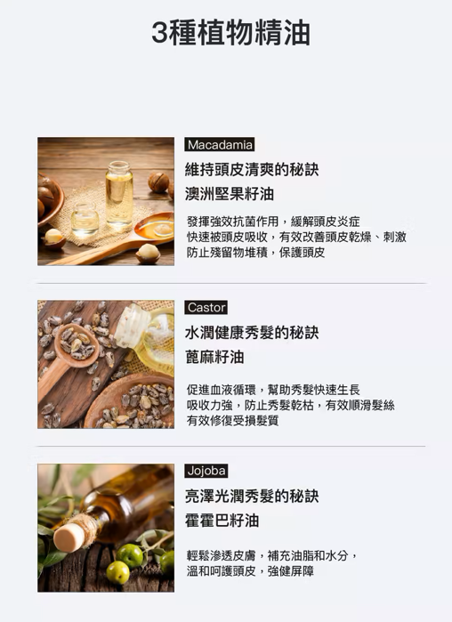 3種植物精油:有效保護頭皮,防止殘留物堆積,改善頭皮乾燥刺激