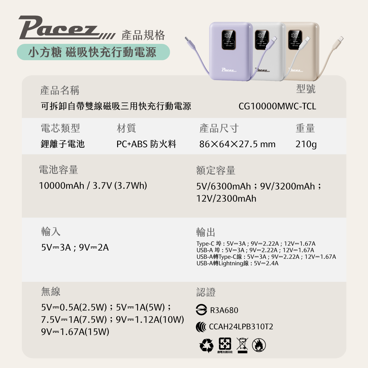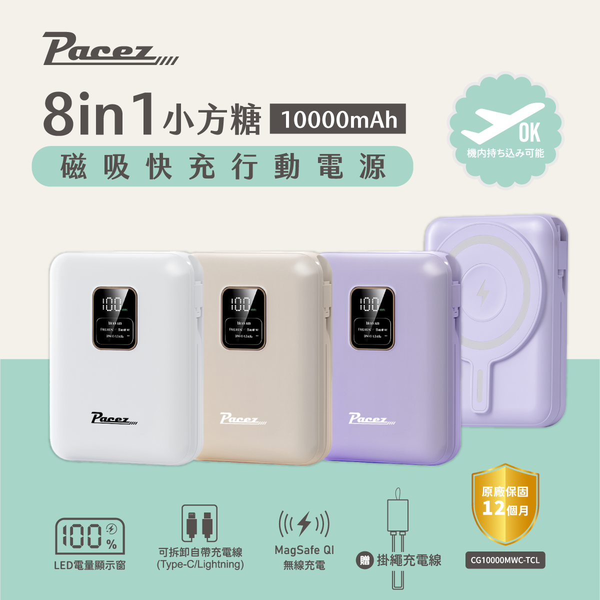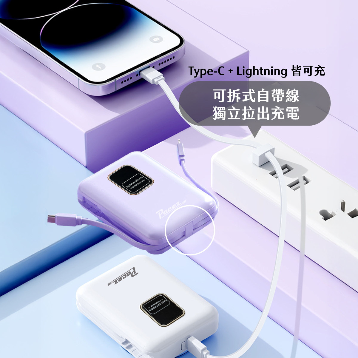 | 【PACEZ】Sugar Cube小方糖八合一磁吸快充行動電源 10000mAh | 奶茶、白色、紫色 | 團購價: 1,190 |