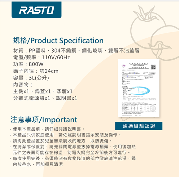 | RASTO 溫控 3L 雙層多功能不沾料理鍋(附蒸籠) | 台 | 團購價: 1,099 |