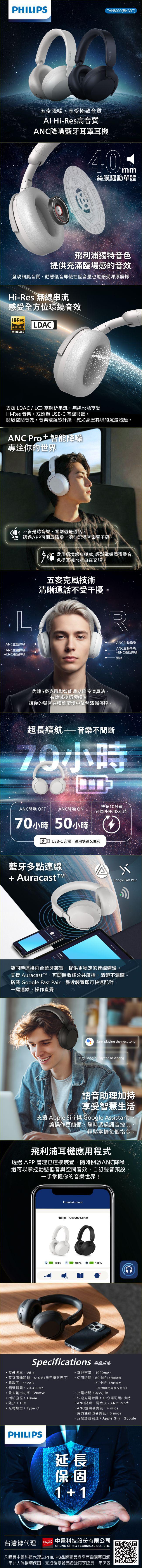 | PHILIPS AI Hi-Res高音質ANC降噪藍牙耳罩耳機 | 黑色、白色 | 團購價: 3,180 |